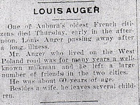 Louis Theophile Auger was the youngest of the three boys in the family. While Pierre (also known as John or JP)and Alphonse worked in the grocery business, bought and sold real estate and became wealthy men in Lewiston, Louis was drawn, like his father before him and generations before, to the life of a farmer. Like the rest of the family, he moved from Biddeford to Lewiston in 1865. Soon after he married Virginie Laflamme, who similarly to Louis, had arrived in Lewiston during the same time period. Family oral history has it that as she arrived in the U.S. the train conductor announced that President Lincoln had been assassinated, although this has not been proven.